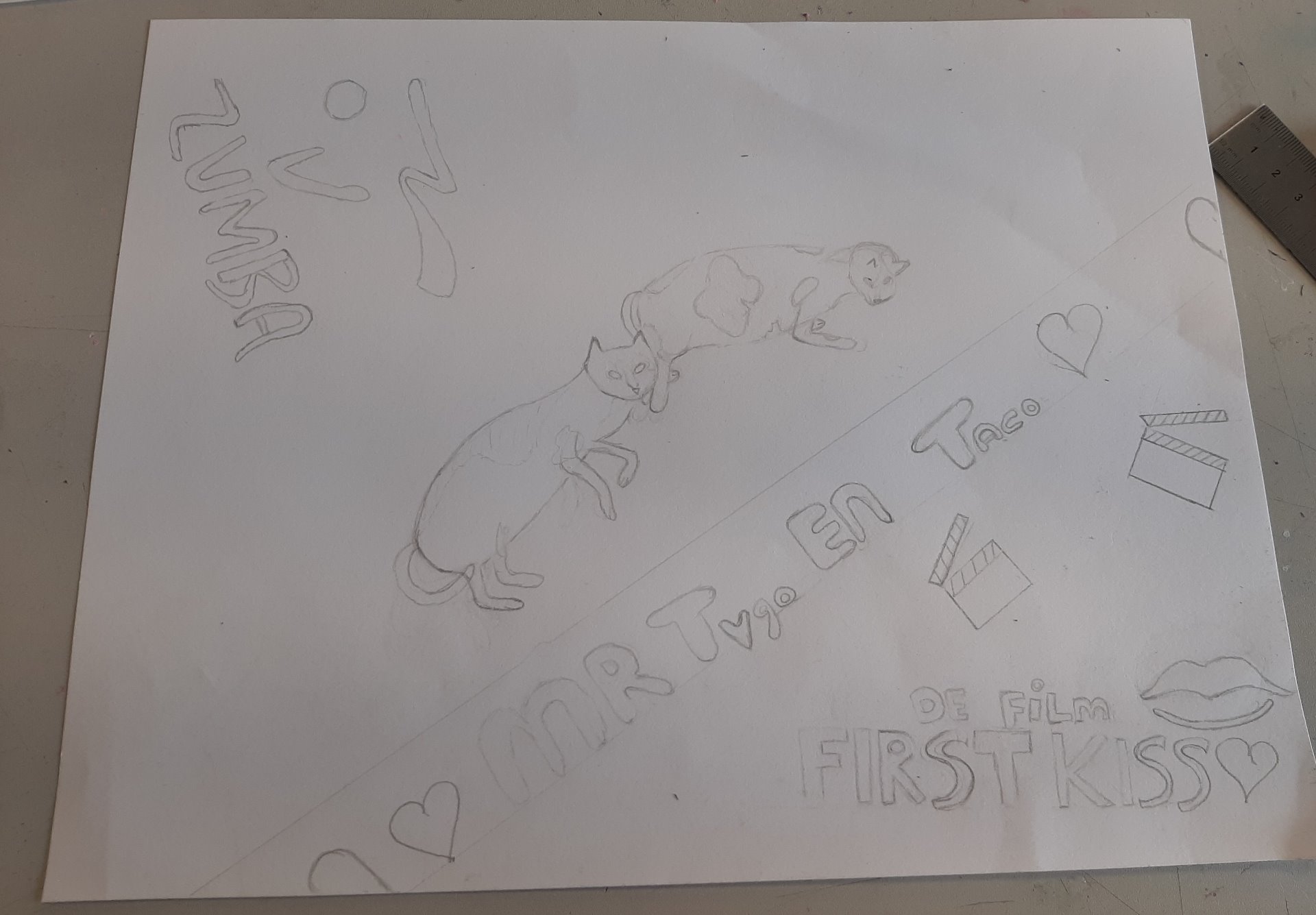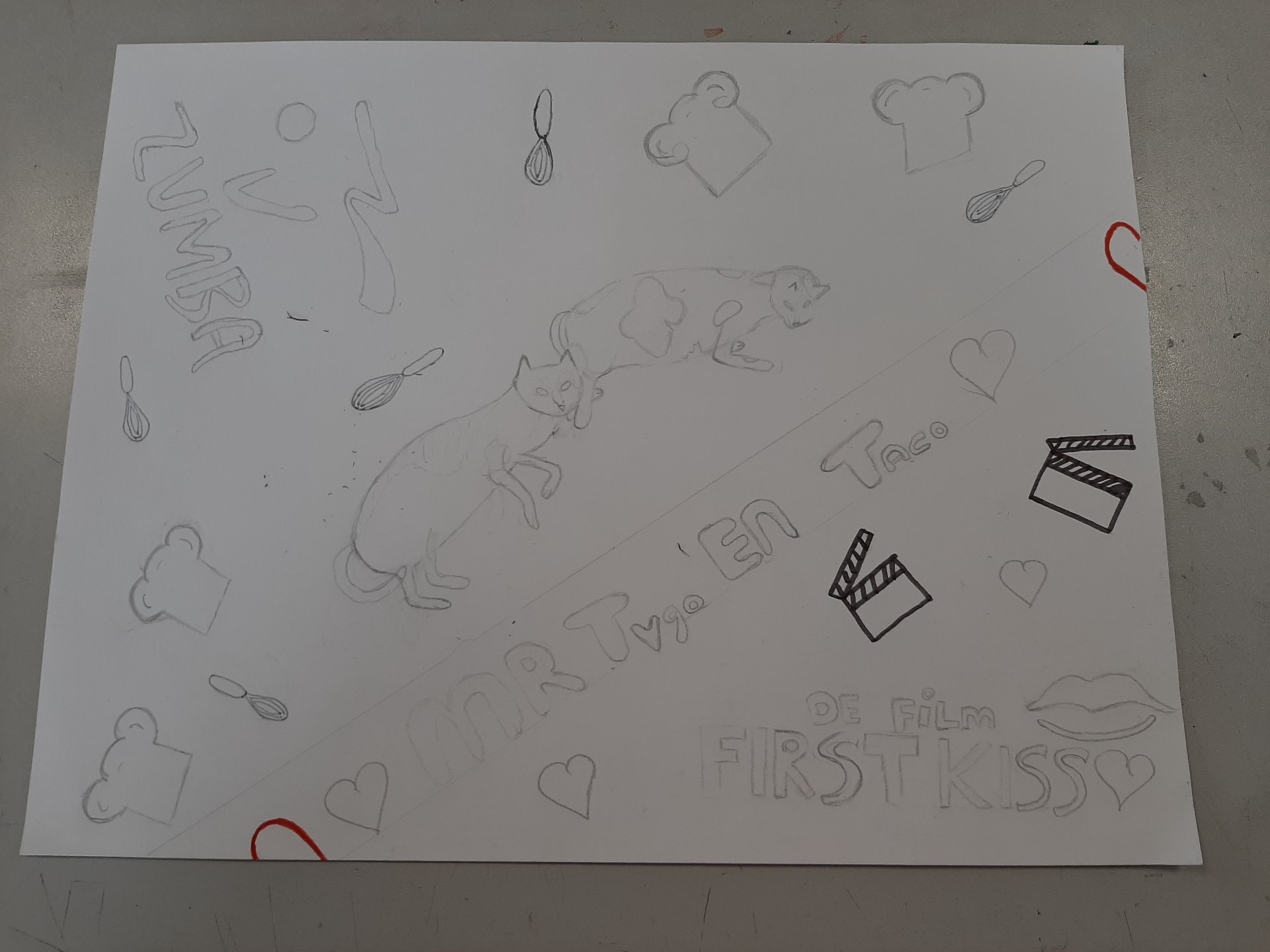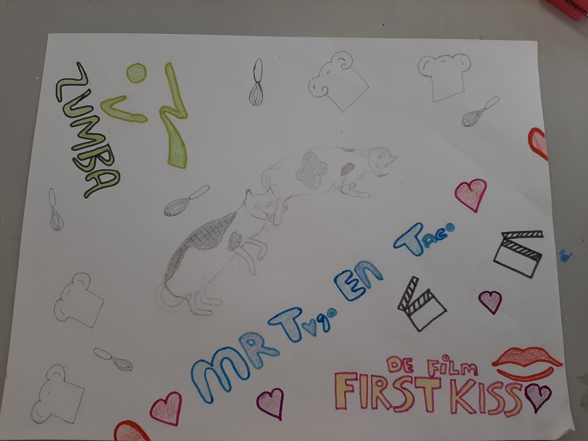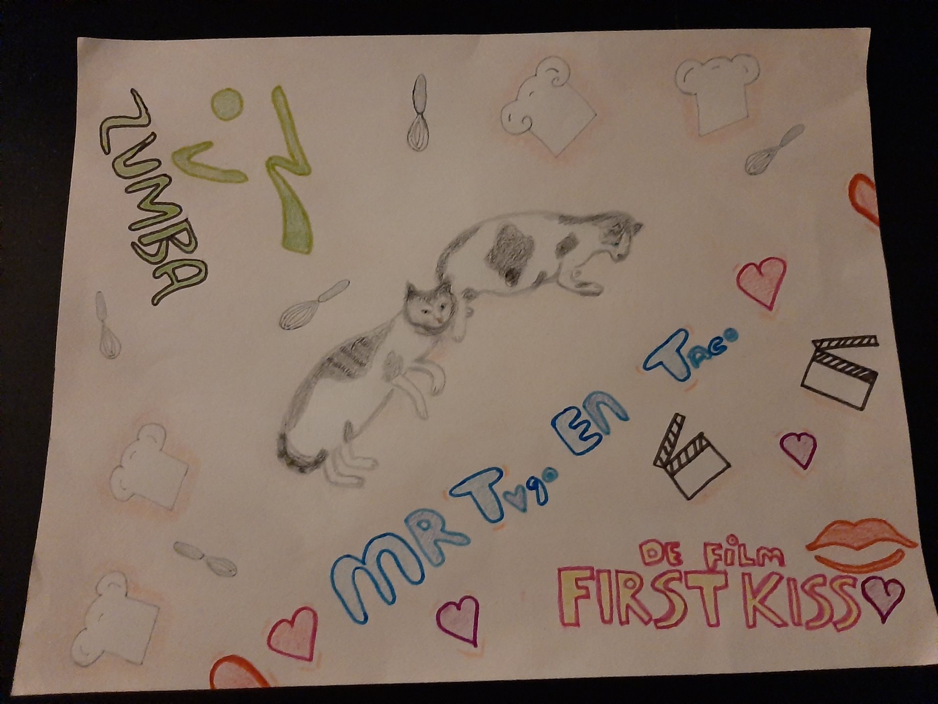 Stap 5: Ik wist niet zo goed wat ik nog meer moest gaan tekenen, maar ik heb 's avonds samen met mijn moeder gekeken wat ik leuk vind en wat ik belangrijk vind en toen zijn wij op het First Kiss logo gekomen. Deze film betekend namelijk heel veel voor mij. Ik heb het hele traject gevolgd (dit leg ik later ook nog uit; zie tabblad 'Film' in het 'menu').