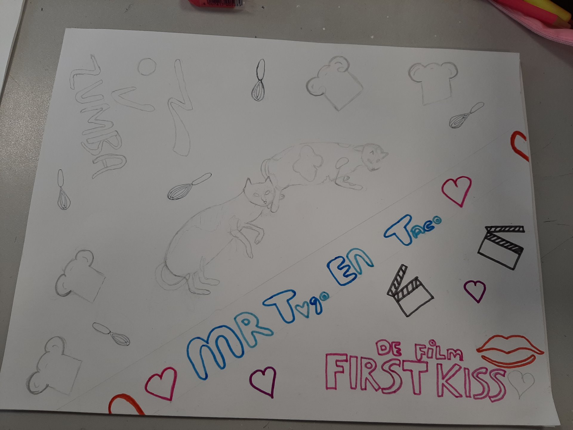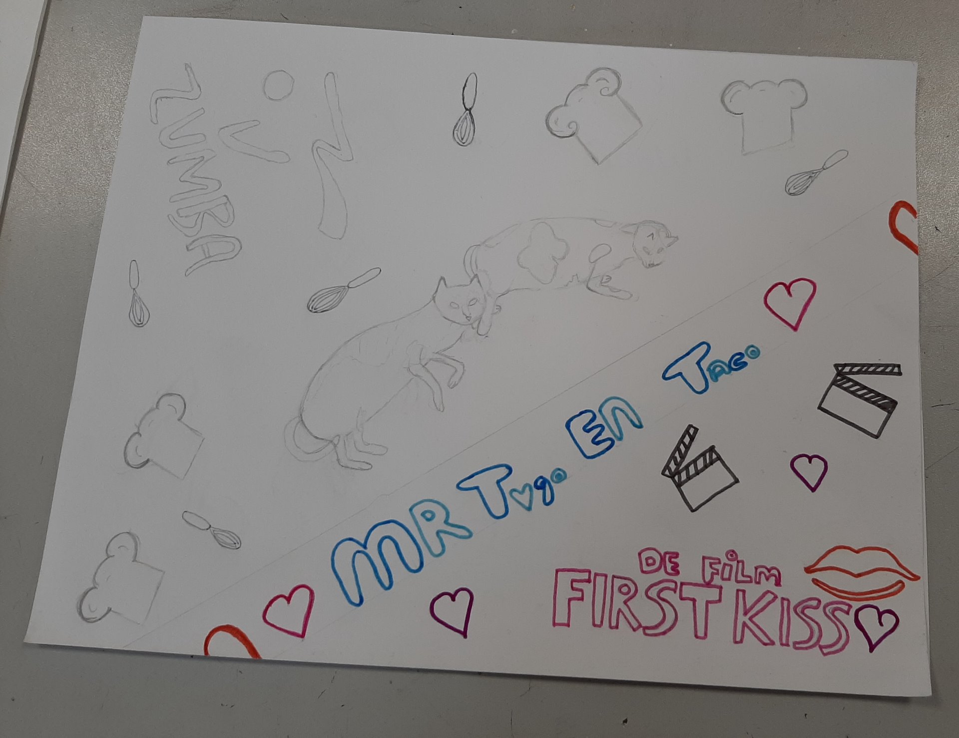 Stap 6: Ik heb dit opgevuld met Filmkappers die gebruiken ze bij films en TV opnames om de volgende scene aan te kondigen. Achter het logo van First Kiss heb ik ook nog een hartje getekend en daarboven lippen. Dit vond ik er nog bij passen.